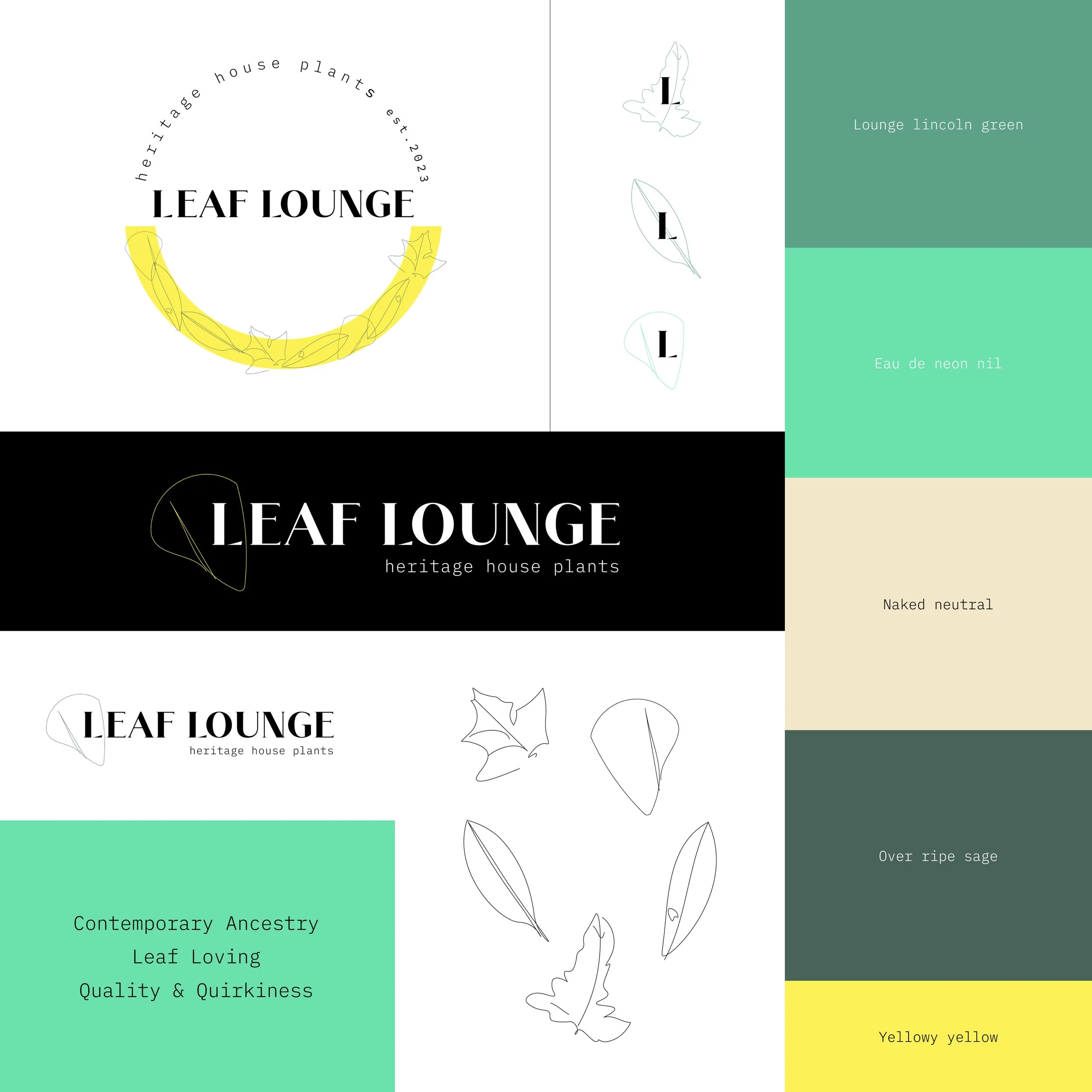 The Leaf Lounge brand blends the warmth of heritage house plants with a quirky contemporary edge. Rooted in the idea of contemporary ancestry, the identity pairs traditional typography with a modern colour palette, creating a balance that feels both familiar and fresh. Hand-drawn, Picasso-inspired line illustrations of leaves add character and personality, while a dynamic logo system — designed to flex between a monogram, roundel, and horizontal lockup — ensures the brand feels expressive, adaptable, and confident across every touchpoint.